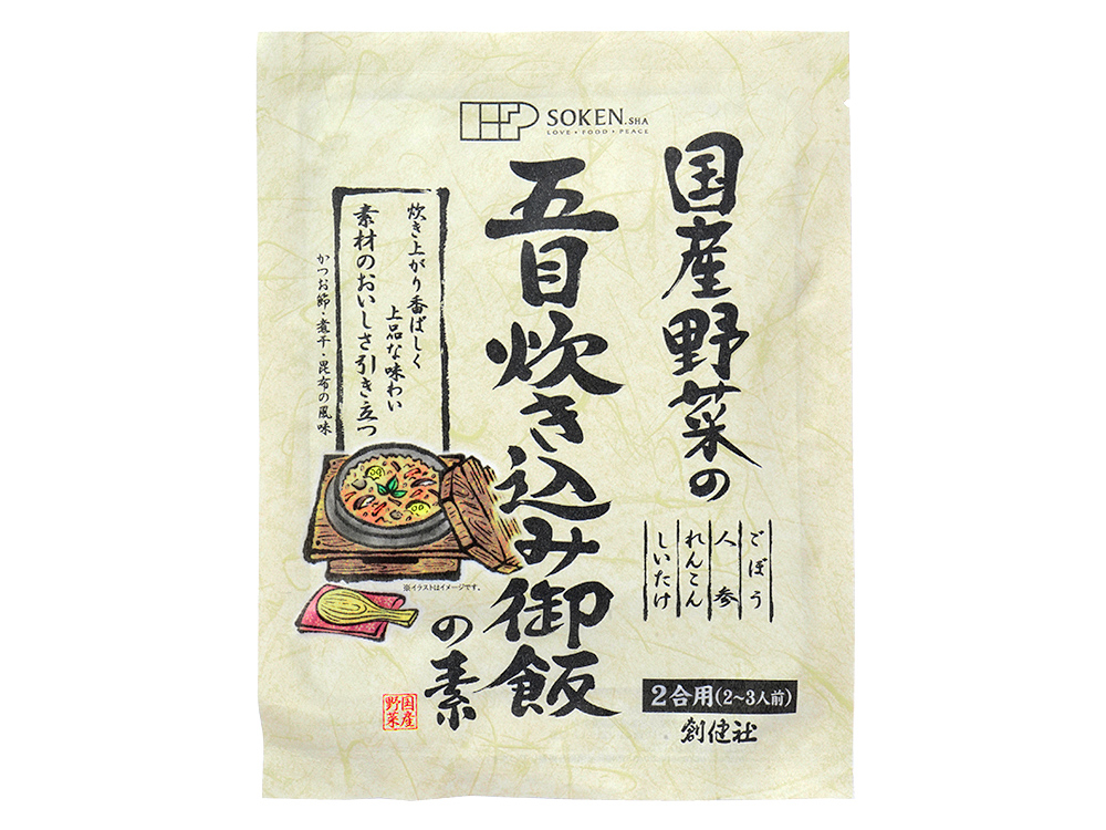 ●国産野菜(ごぼう、人参、れんこん、しいたけ)と国内製造のこんにゃくを、煮干、かつお、昆布の風味豊かな和風だしで仕上げた五目炊き込み御飯の素です。