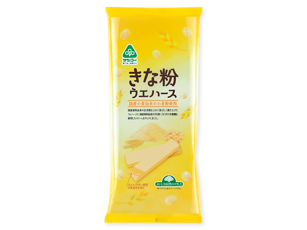 国産原料由来の玄米粉を入れて香ばしく焼き上げたウエハースに、国産原料由来のきな粉、さとうきび含蜜糖を使用したクリームをサンドしました。