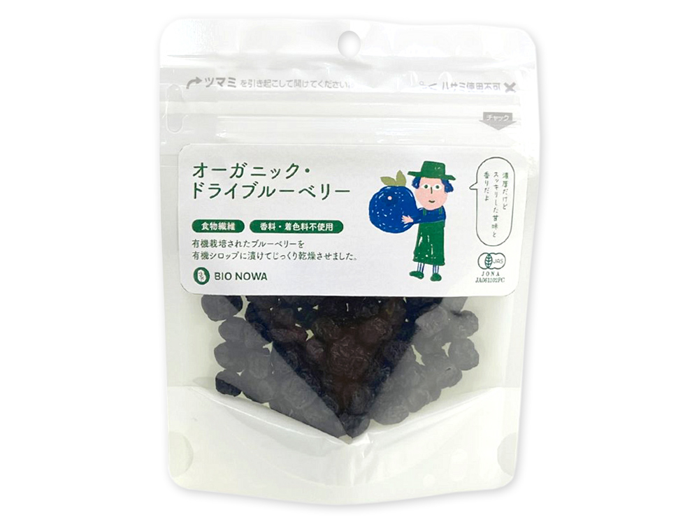 アメリカで有機栽培されたブルーベリーが原料です。ブルーベリーは糖度が低いため、乾燥後のソフトさを保ち、保存性を高めるために有機砂糖を加えて糖度を調整しています。また、乾燥と固着を防ぐために少量(1%未満)の有機ヒマワリ油で表面をコートしてあります。