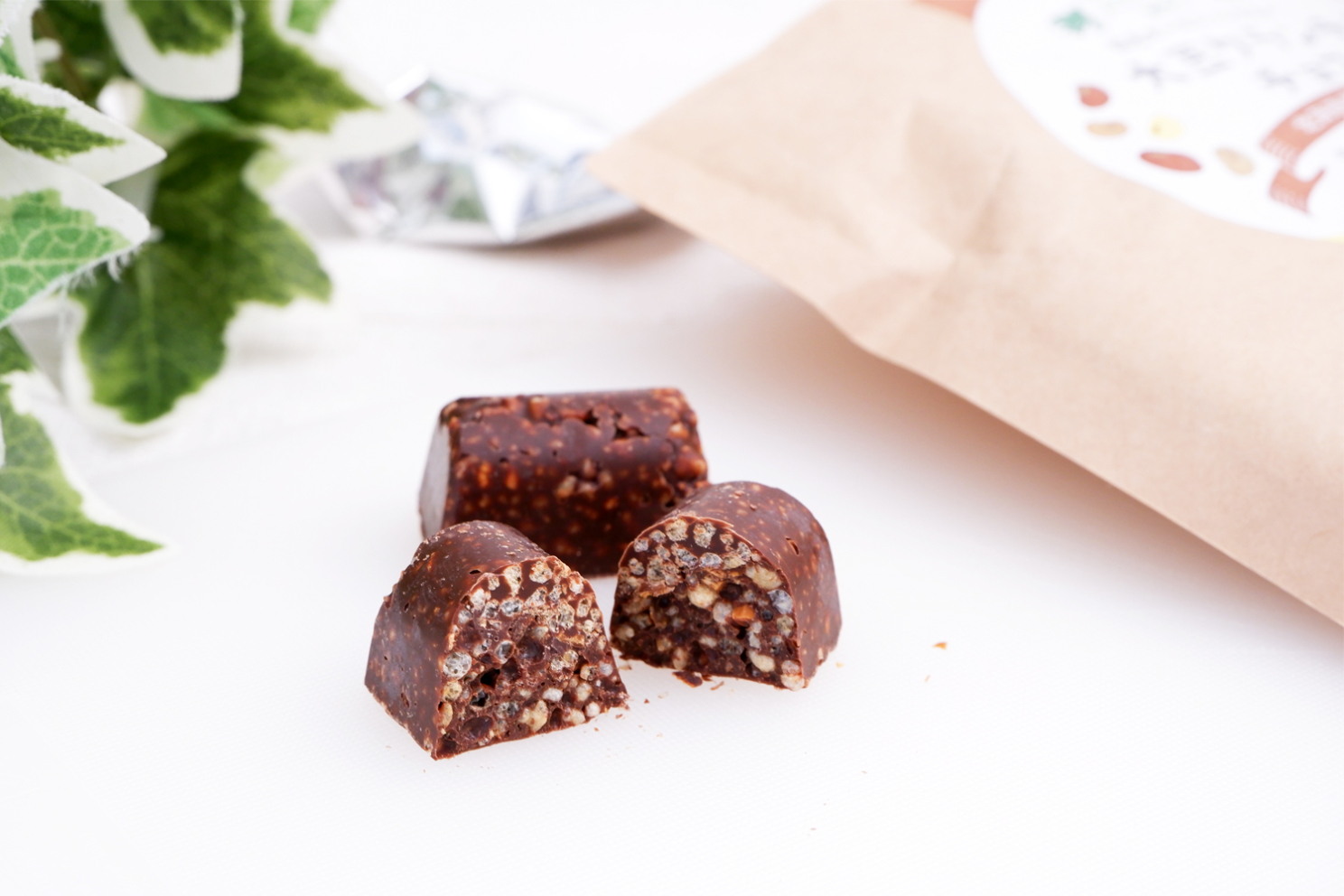 サクッと軽い食感、大豆の香ばしさ、チョコレートの控えめな甘さが調和した美味しさです。